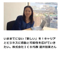 営業事務、パソコンインストラクター、キャリアカウンセラー、独立系コンサルタントを経て、キャリア開発・組織活性化・人材育成を支援する「株式会社 ICB」を設立。 平成 27 年ひょうご女性未来・縹(はなだ)賞受賞。