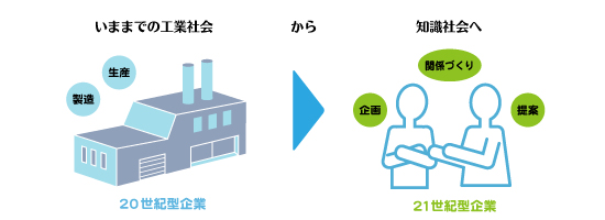 20世紀の工業社会(機械や組立ラインが生産の手段)から21世紀の知識社会(社員各自の知恵や経験・考える力が生産の手段)になった今、これからは「いま話題になっているのはどんなトピックなのか?」「世間の人はそれについてどう思っているのか?」「自分が関わっているプロジェクトについて業界の最新動向はどうなっているのか?」そんなアイデアや新しい提案をしていく力が必要です。しかし、そんなアイデアは社内にいて同じようなメンバーで会議室で考えているだけではなかなか出てきません。