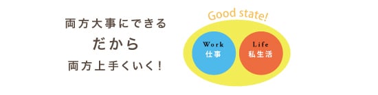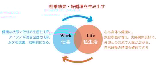 ワークライフバランスとは、私生活の充実により、仕事がうまく進み、仕事がうまくいくことによって、私生活も潤うという「仕事と生活の相乗効果を高める考え方と取組み」全般を指します。どちらか一方を選ぶと、どちらかを犠牲にせざるを得ないというものではなく、両方を大事にすることで、個人は幸せを感じ成長することができます。そういう個人が集まる組織こそがこれからの時代、より成長・発展していくと考えられるでしょう。